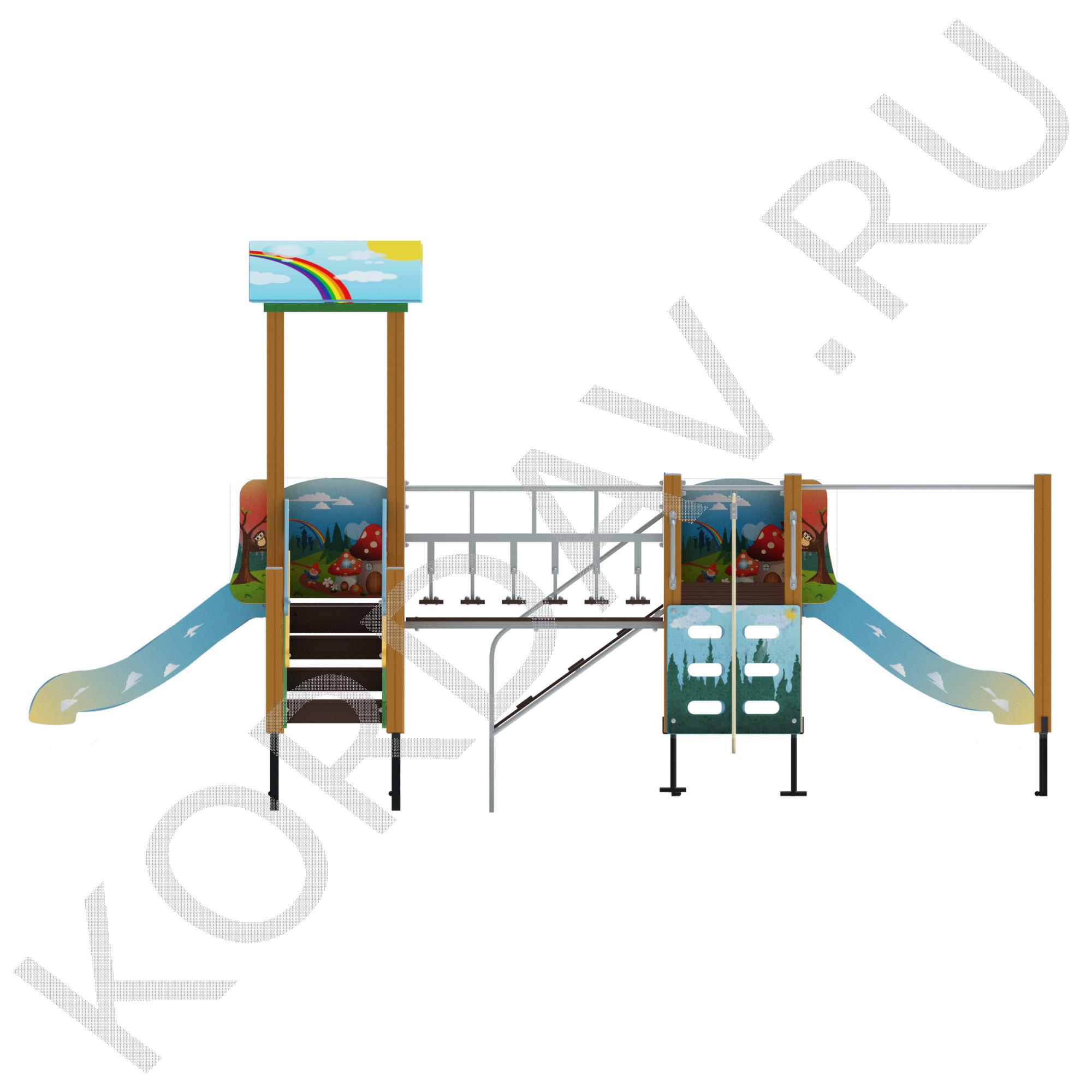 Комплектация: Башни (3 шт.),Ограждения башен (2 шт.),Дугообразный мост (1 шт.),Ограждения дугообразного моста (1 комплект),Лестница (1 комплект),Пандус (1 шт.),Подвесной мост (1 шт.),Скалолаз (1 шт.),Шведская стенка (1 комплект),Рукоход (1 шт.),Горка ( 2 шт.)